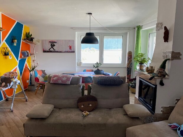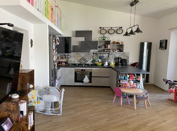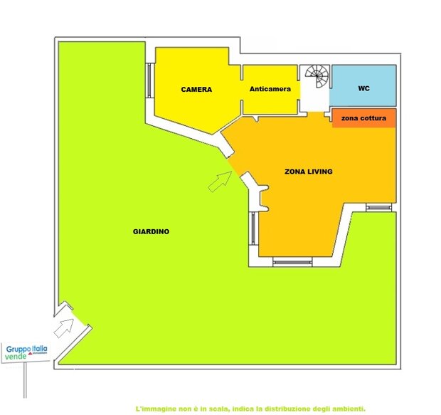 L'immobile, di 85 m² (in totale sui 2 livelli), è composto, al piano terra da una grande zona living con camino e cucina a vista arredata, un disimpegno, una camera da letto con anticamera per allocare gli armadi guardaroba, un bagno e un piccolo ambiente al primo piano, affacciato sulla zona living, utilizzabile come studio e raggiungibile tramite una scala a chiocciola interna all'abitazione.
