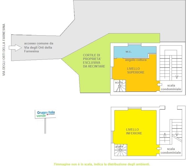 II livelli: piano rialzato e piano leggermente seminterrato - Doppia entrata, sia dal livello superiore che da quello inferiore - Posizione tranquilla e riservata - Cortile di proprietà esclusiva da recintare di 65 mq - Accesso carrabile direttamente da Via degli Orti della Farnesina - Riscaldamento autonomo.