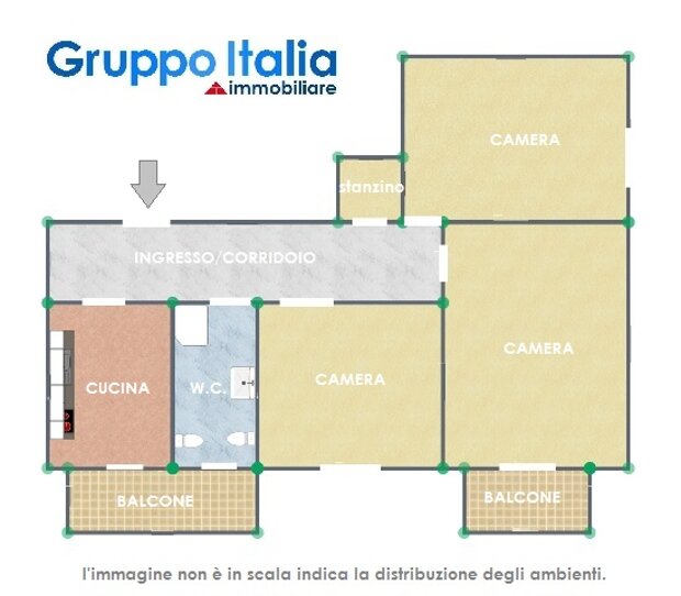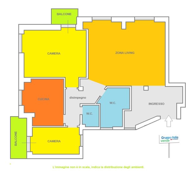 Appartamento in discrete condizioni di manutenzione, che offre una grande zona living, una cucina abitabile, un disimpegno, una camera da letto, una cameretta, 2 bagni e 2 balconi