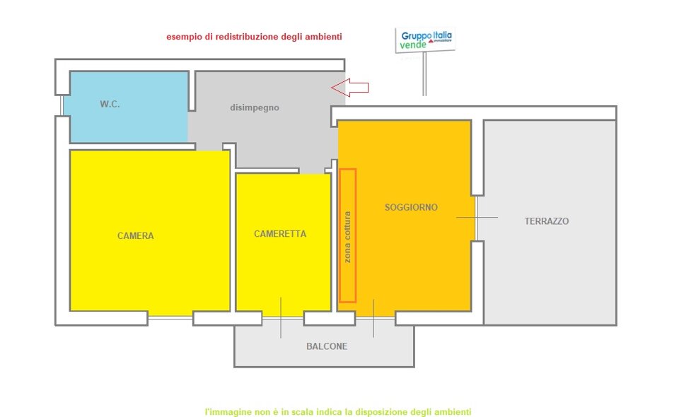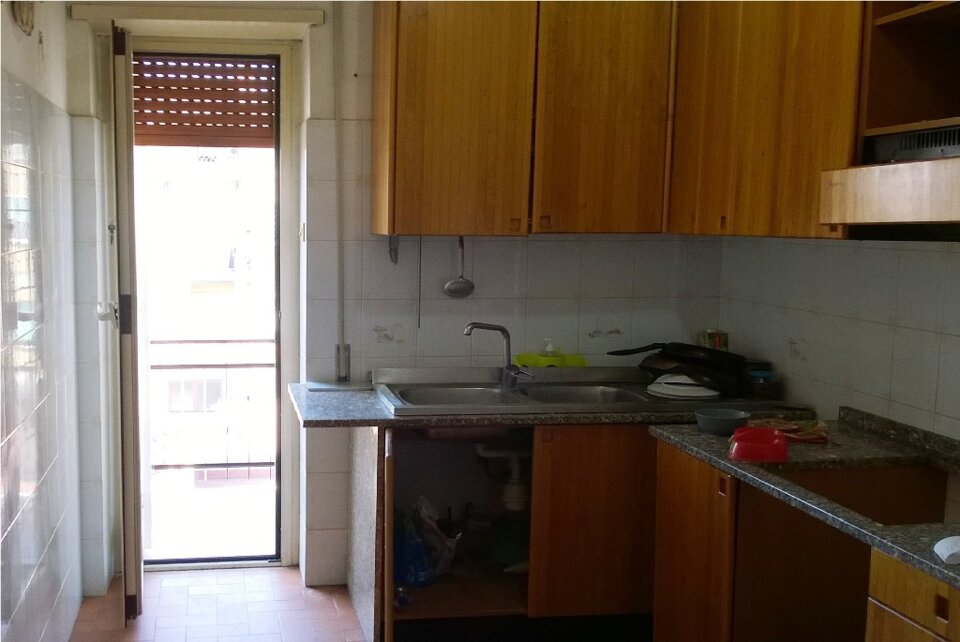 Appartamento che offre un ampio ingresso, due grandi camere, una cucina abitabile, un bagno, un balcone e un terrazzo con affaccio dominante. L'immobile per la sua conformazione è facilmente trasformabile (spostando gli attacchi, dalla attuale cucina, nel soggiorno) in soggiorno con angolo cottura, camera, cameretta.