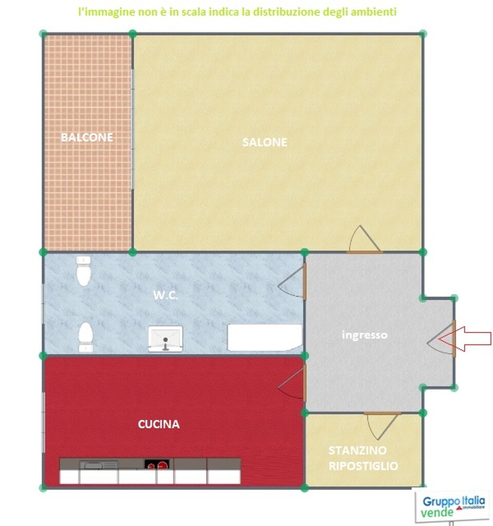 Appartamento che offre un ampio ingresso, un salone, una cucina abitabile, un bagno e un balcone. L'appartamento è facilmente rimodulabile in saloncino a vista con angolo cottura, camera, bagno e balcone.