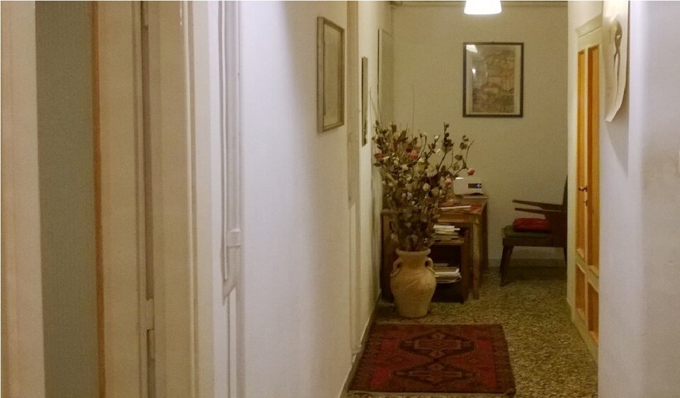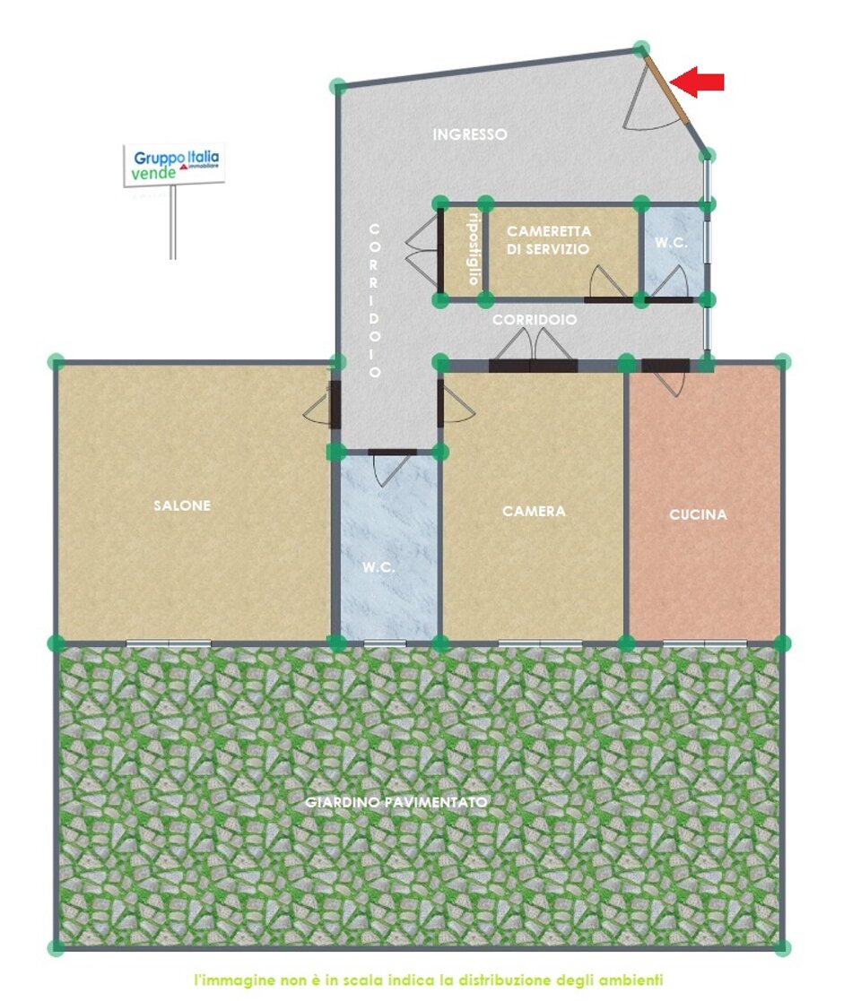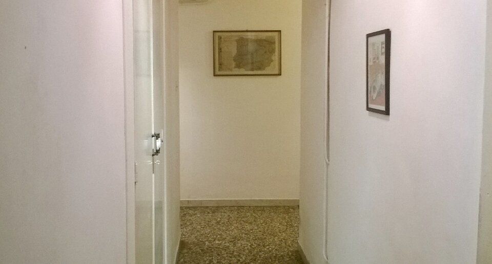 Appartamento che offre un grande ingresso abitabile con finestra, un salone, un ampio corridoio con armadio a muro e ripostiglio, una camera da letto, una cameretta di servizio, 2 bagni ed un grande giardino pavimentato.