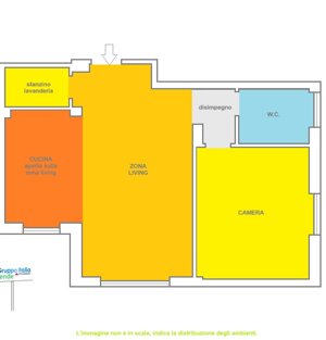 Appartamento con ampia zona living camera cucina bagno e ripostiglio lavanderia