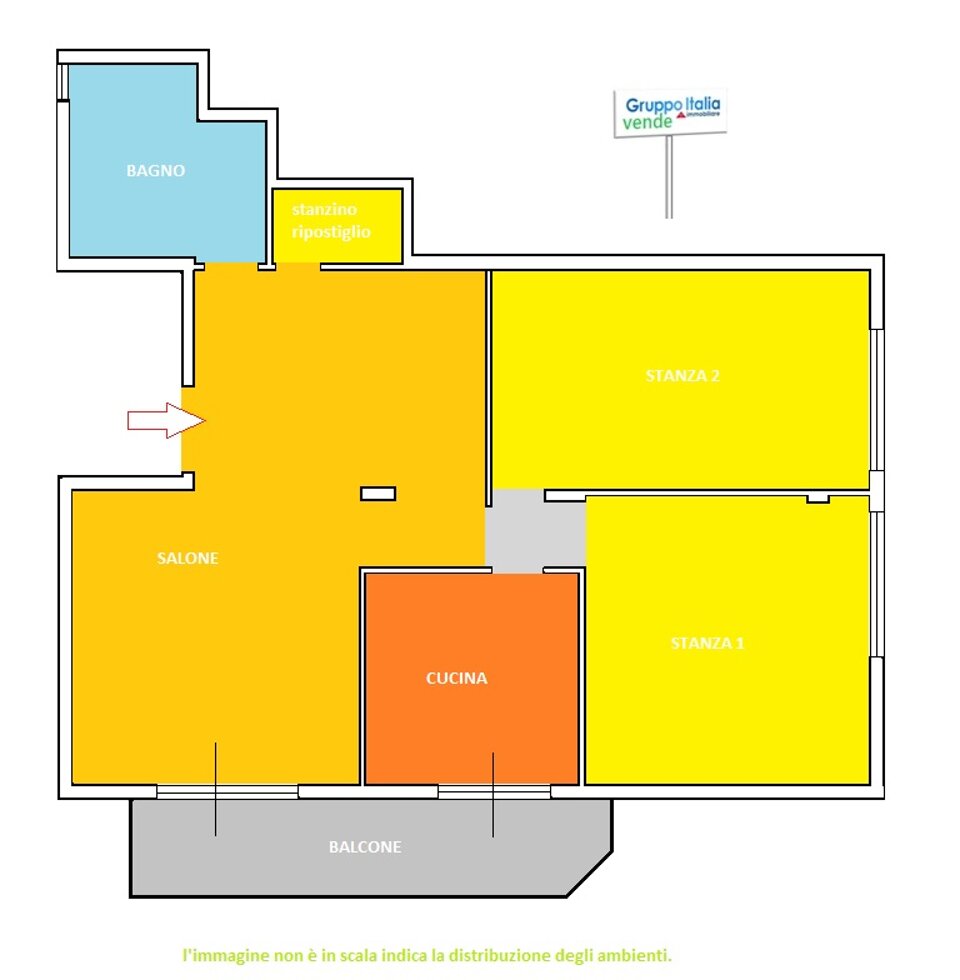 Appartamento che offre un ampio ingresso abitabile aperto sul salone, una cucina abitabile, due grandi camere, un bagno e un balcone.